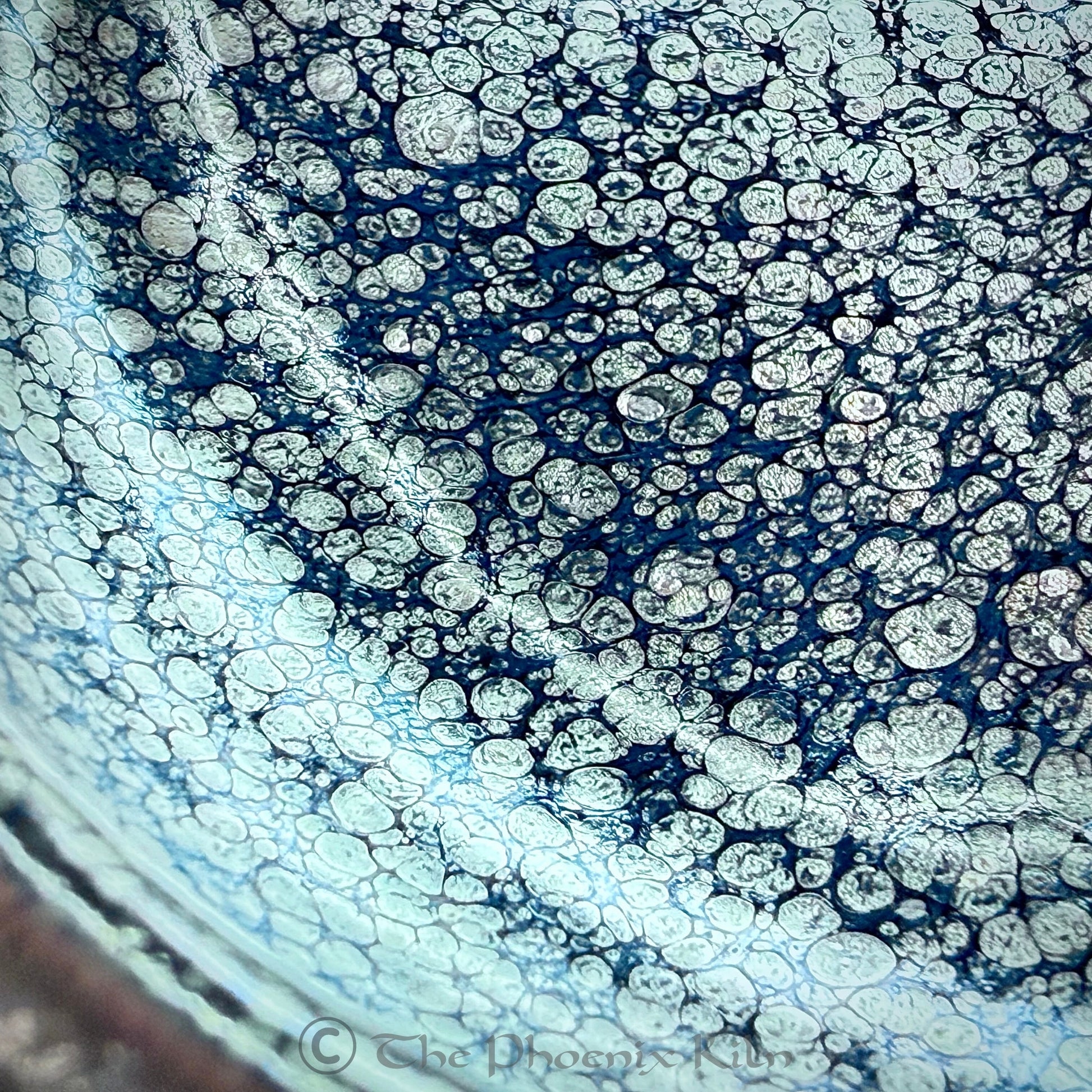 At rest, the vessel glows with the quiet of deep water, a nocturnal blue that gathers its own gravity. Tilt it toward the light, and a living cosmos ignites—a universe contained in clay.