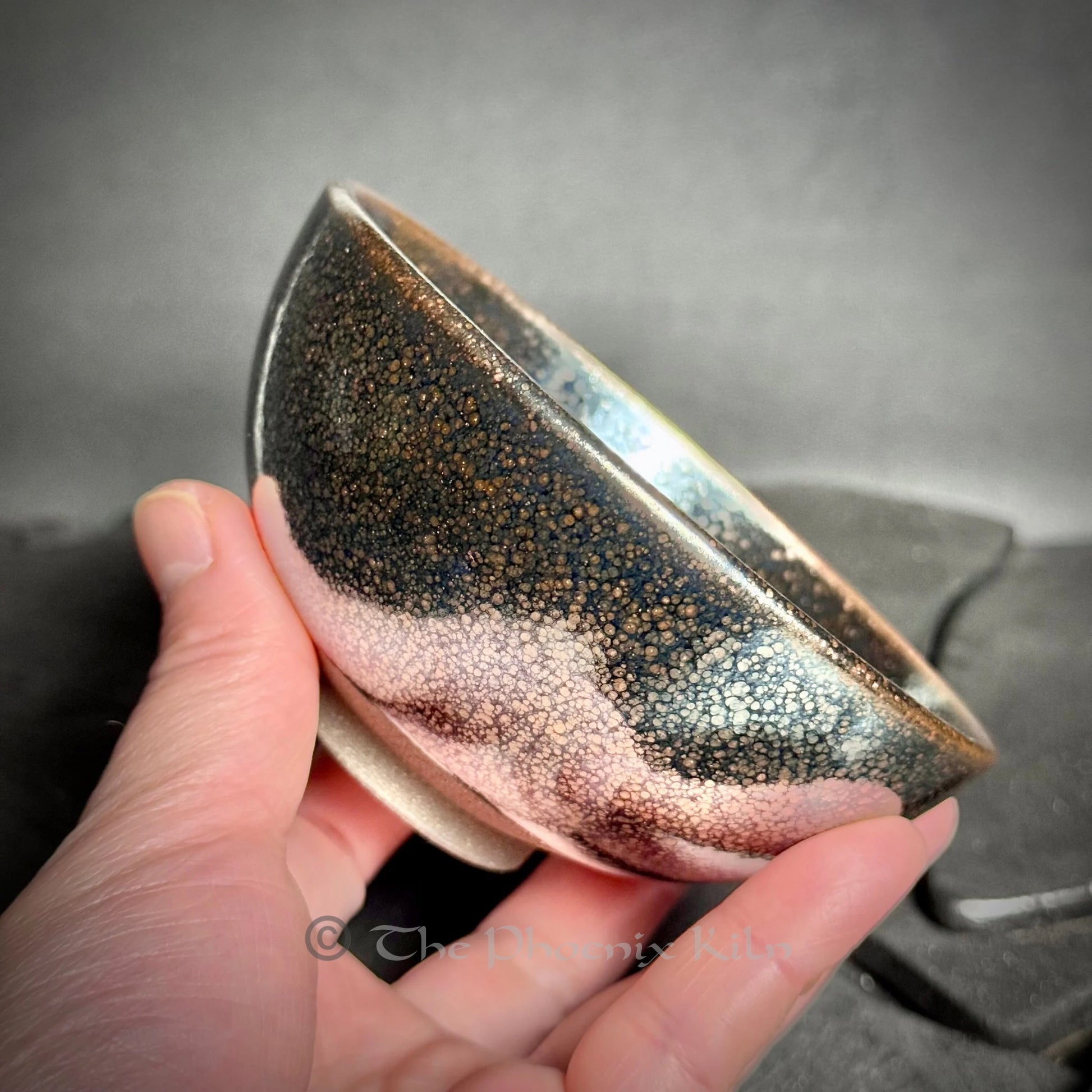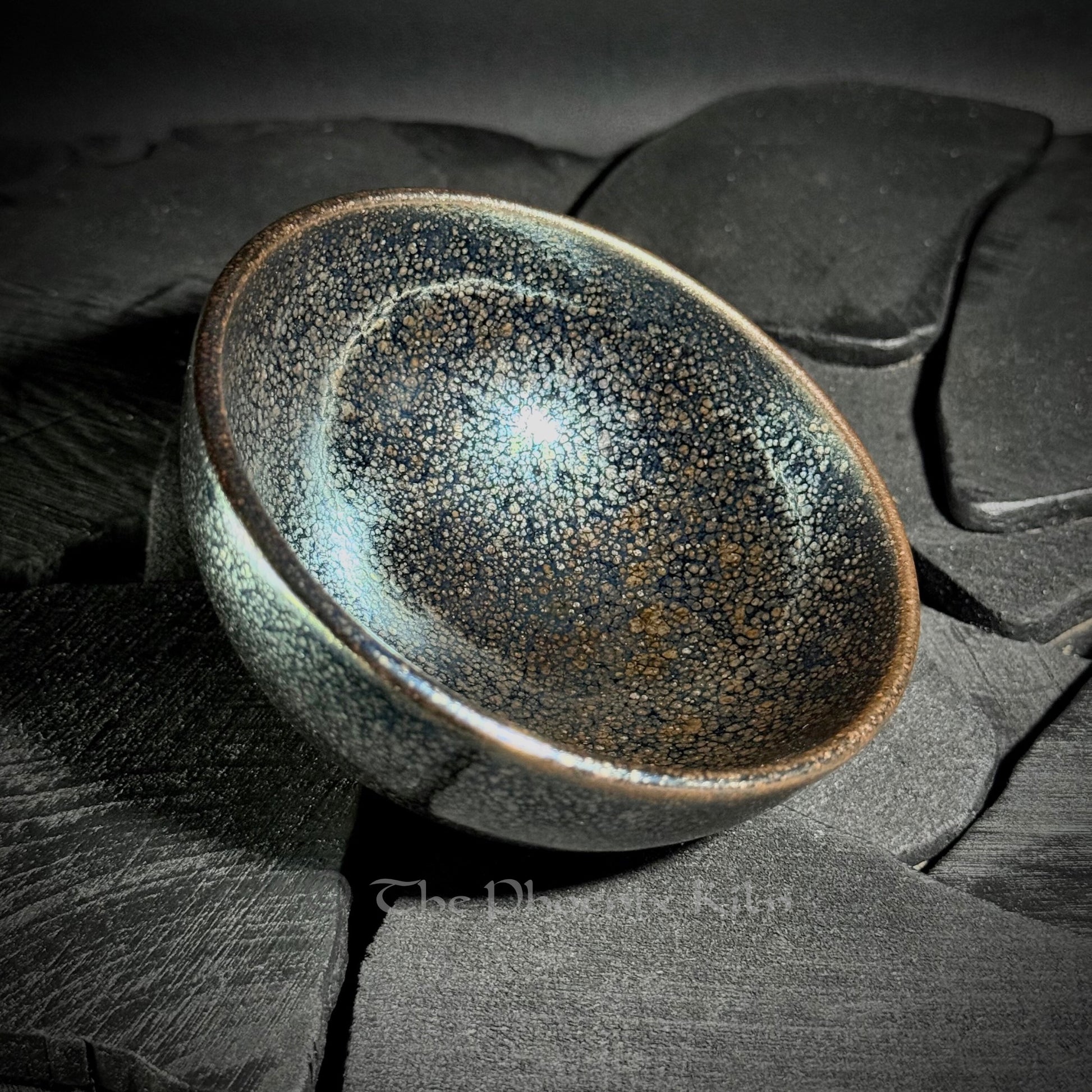Developed as a TPK exclusive, Starveil displays an unusually uniform field of micro-crystalline oil spots, formed through The Phoenix Kiln’s proprietary high-iron glaze. Its cool blue-silver surface reveals a precise equilibrium of texture and tone, showing subtle chromatic shifts under natural light. Hand-thrown in Shuiji, Jianyang, using local iron-rich clay and an exclusive glaze formulation.